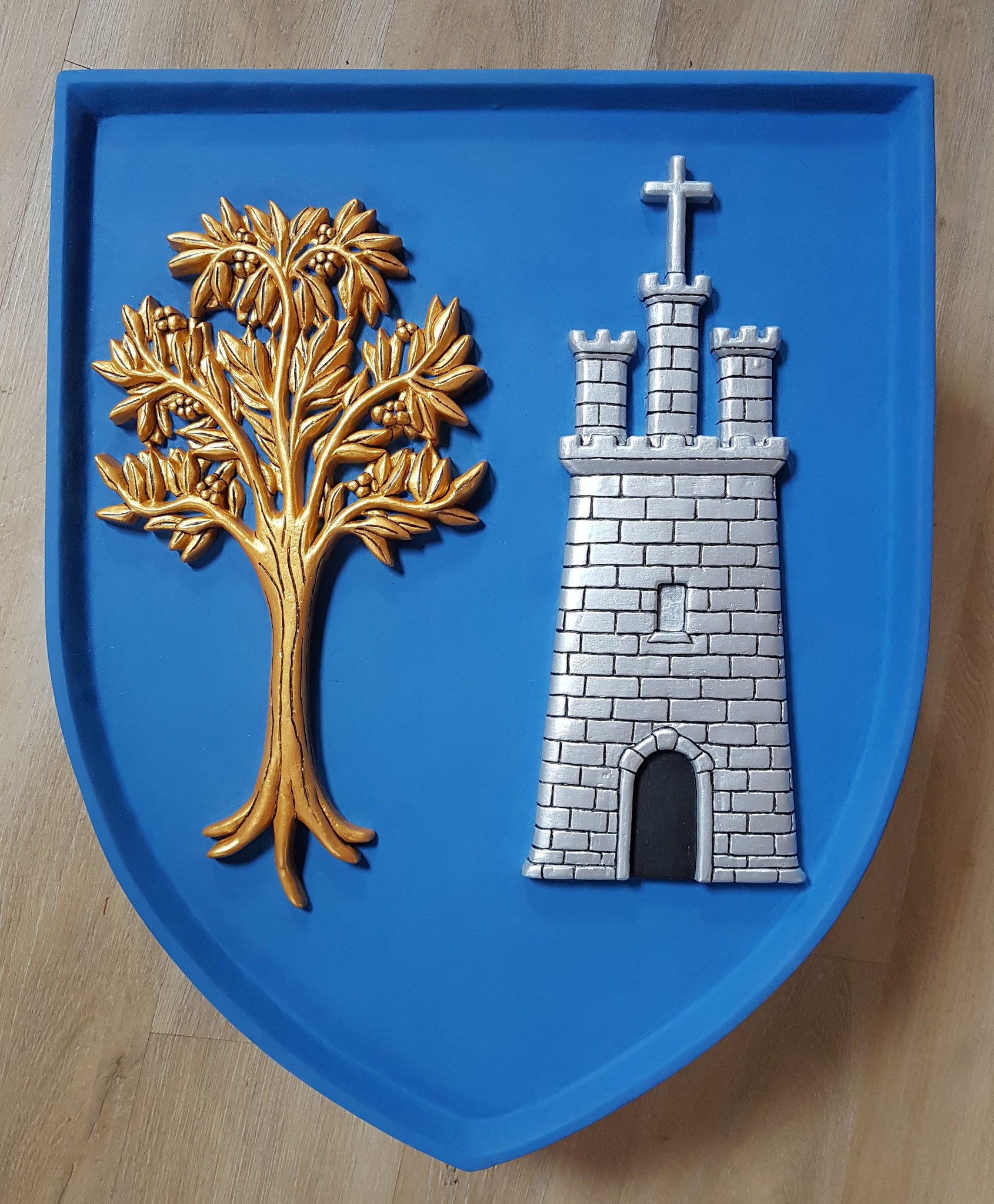 Blasons et ornements type lambrequins et cimiers, supports et nom ou devise sculptés en bas-relief sur pierre reconstituée de taille 40x50cm,45x55cm ou 52x67cm.